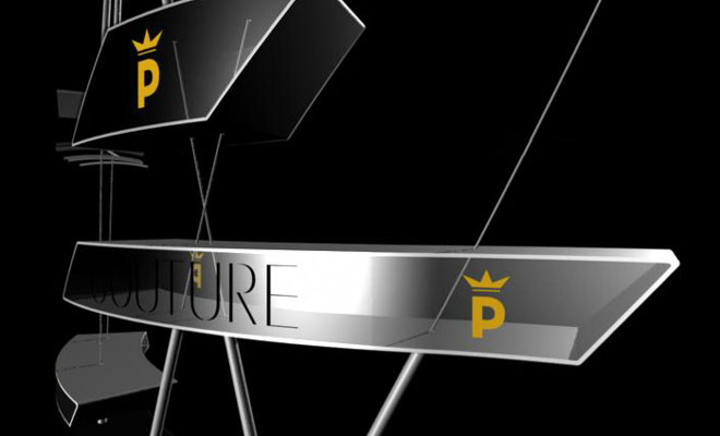 Couture Studie 2003 Shop Design Frei im Raum angeordnete Vitrinen übersetzen die speziell für die Couture Line konzipierte Grafik in ein räumliches Erlebnis. Die einzelnen Elemente sind mit einem Netzwerk aus Rohren und Seilen im Raum fixiert und sind untereinander mit Hängevorrichtungen für Kleider verbunden. Die Vitrinen werden, abgestimmt auf den jeweiligen Shop, fix auf einer Bodenplatte verankert oder ragen von der Decke in den Raum. Die Elemente werden aus 15mm starken Aluminiumplatten gefertigt und sind beidseitig mit Schiebeelementen verglast. Ausgestellt werden Accessoirs, Schuhe und kleinere Artikel. Alle Elemente können auch einzeln, ähnlich Schmuckkästen, in Auslagen gezeigt werden. |